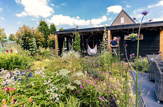 ‘Wij wilden overzicht en ruimte. De oplossing vonden we in…onze tuin! Daar stond namelijk altijd al een schuurtje, te klein om fietsen kwijt te kunnen en met beperkte isolatie niet geschikt voor gereedschap en andere spullen. Daarnaast wilden wij ook meer gebruik kunnen maken van onze tuin. Zo ontstond het idee om daarin een grotere schuur te bouwen mét een overkapping. Zodat we een deel van onze spullen van de garage naar de schuur konden verhuizen én we buiten een fijne beschutte zitplek konden creëren. We bedachten dat we dan ook direct de tuin wilden betegelen en opnieuw beplanten. Kortom: onze tuin en het oude schuurtje gingen op de schop!’